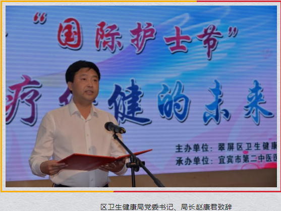 赵康君代表翠屏区卫生健康局党委、行政向全系统坚守护理岗位、奋战疫情防控一线的广大护理工作者致以崇高的敬意和节日的问候。赵康君提出,今年的护士节活动和党史学习教育结合起来,是希望翠屏区医务工作者立足岗位,围绕“学党史、悟思想、办实事、开新局”的要求,引导翠屏区卫生健康系统全体党员干部进一步传承红色革命精神,弘扬伟大抗疫精神,激励广大护士心向党、跟党走,在新时代、新征程中奋发有为、担当作为,努力为人民群众提供高质量的护理服务。