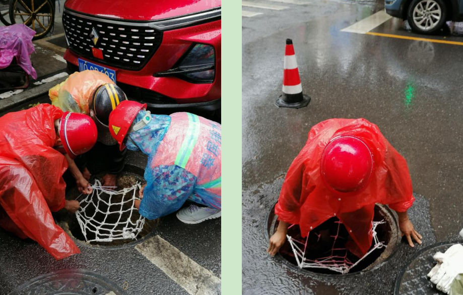 安装现场,施工人员按照打孔、安装挂钩、挂网等工序有序加装防坠网,每完成一个都进行亲身试踩检验,保证安装牢固。截至目前,老城区、上江北片区雨污水管网检查井防坠网共计安装300余个,有力保障主汛期市民出行安全。