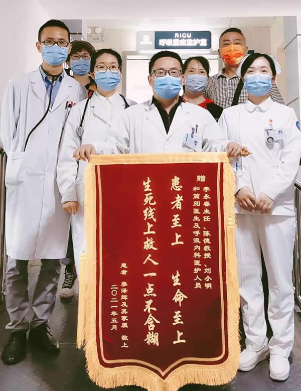在无创呼吸机辅助通气支持下,患者顺利转到一医院呼吸与危重症医学科重症监护室(RICU)病房。科主任李永春和护士长曾田平分别牵头成立了治疗和护理团队。