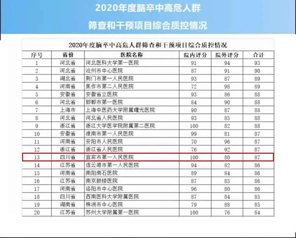 2020年度我院脑卒中高危人群筛查和干预项目全国排名第13名
