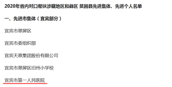 四川新闻网消息 2021年5月26日,在中共四川省委办公厅、四川省人民政府办公厅日前印发的《关于表扬2020年脱贫攻坚先进集体和先进个人的决定》中,宜宾市一医院获评2020年省直部门(单位)对口帮扶先进集体。