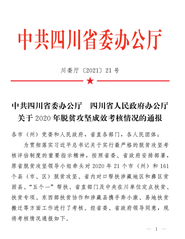 同时,在中共四川省委办公厅、四川省人民政府办公厅印发《关于2020年脱贫攻坚成效考核情况的通报》中,宜宾市一医院在省直部门及在川单位定点扶贫工作成效考核中,再次获评综合评价“好”,受到通报表扬。