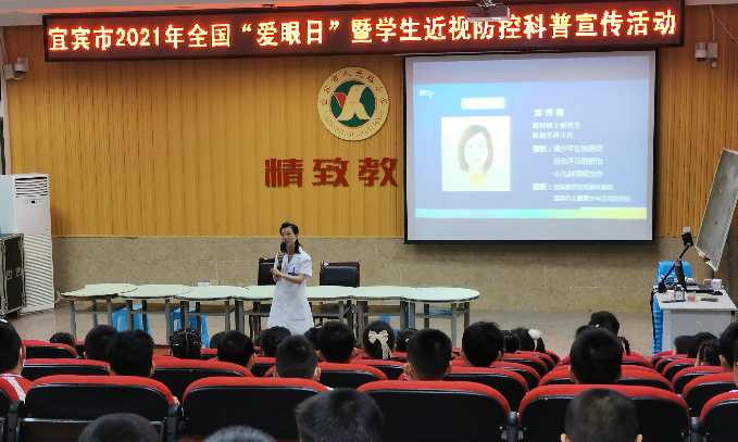 宜宾市疾控卫生监测科科长张念军介绍了宜宾市儿童、青少年近视监测情况,宜宾爱尔优视眼科医院眼视光科刘秀丽主任系统全面介绍了“近视形成的原理、主要危害及防控策略”,翠屏区疾控中心通过师生互动答疑等环节,系统深入地普及学生近视防控相关知识。