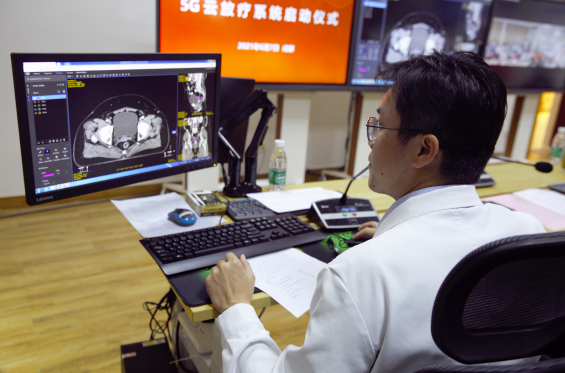 | 四川省肿瘤医院的专家通过移动5G云放疗系统对患者需要放疗的靶区进行实时勾画 |