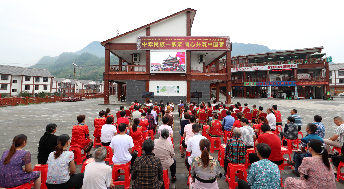 7月1日,宜宾兴文县麒麟苗族乡龙泉聚居点,党员干部和周边群众在民族团结广场集中收看庆祝大会直播。