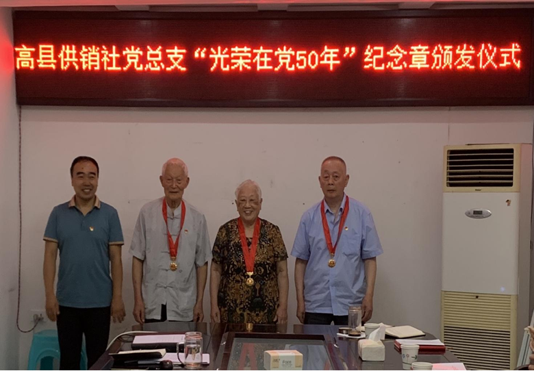 四川新闻网消息 在中国共产党成立100周年之际,高县供销社党总支为供销系统5名“光荣在党50年”纪念章获得者颁发纪念章。“七一”前,高县供销社党组书记(兼党总支书记)、理事会主任闵诗涛为前来参加党史学习教育的代德元、罗桂芳、熊金林3名老党员集中颁发纪念章。