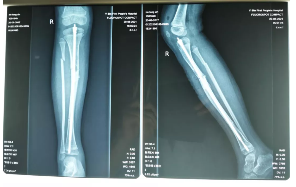 该患者因骨肿瘤引发胫骨骨折,但因为骨科矫正手术所使用的传统钢板螺钉对小孩子的创伤较大,一直在寻求其他治疗方式,家长辗转多地求医效果不佳后来到宜宾一医院骨科治疗。