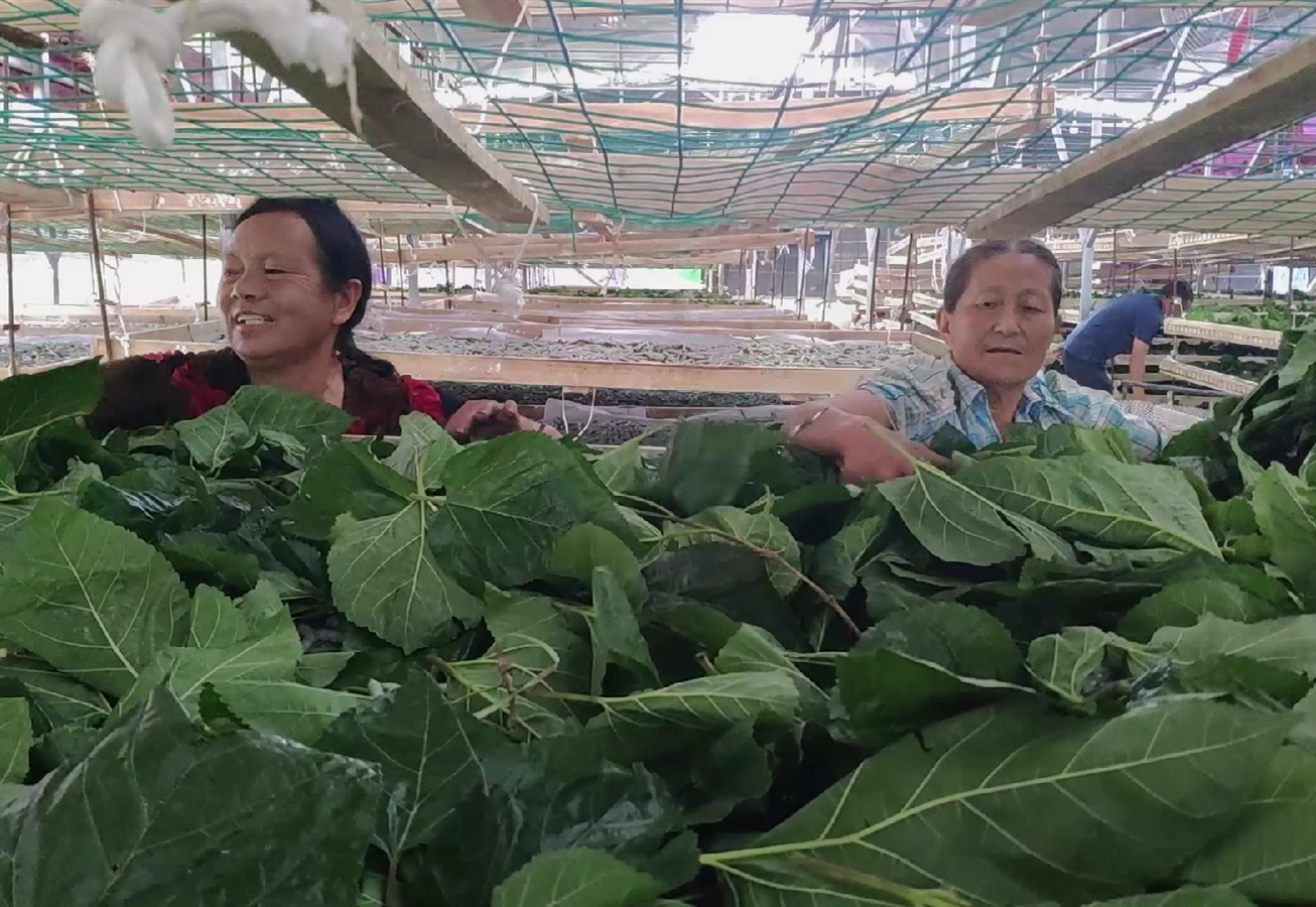 51岁的村民刘启英正和乡亲们忙着采摘桑叶,她说,在这里养蚕可比在自家种地赚得多,每天收入有八九十元,一年下来有一万多元的工资,这份收入让她很满意。