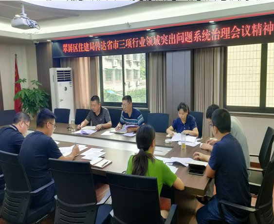 会议传达了市住建系统三项行业领域突出问题系统和专项治理工作指示精神和四川省住房和城乡建设厅关于召开深化全省建筑企业资质审批突出问题系统治理推进工作电视电话会议精神;党委书记严先兵同志通报了区住建招投标、建筑企业资质审批推进情况,并对下一步工作做了安排部署;区纪委监委驻市住建局纪检监察组组长传达了市上通报招投标领域线索转案件相关情况。