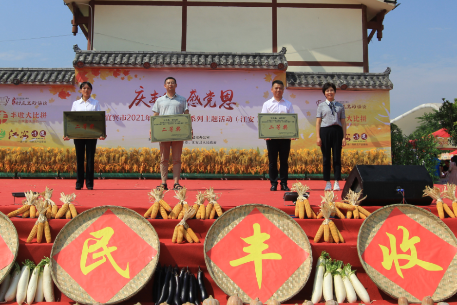 伴随着欢快节奏,丰收节活动正式开始。县委书记李强宣布宜宾市2021年农民丰收节系列主题活动(江安主场)开幕。在特色农产品展销区域,“一镇一味”特色农产品很受群众欢迎。阳春镇带来的安乐银元酱油、椒园花椒和七彩湖鳗鱼更是一摆上展台,很快就被抢购一空。诵读展演上,阳春镇代表队参赛作品《丰华阳春 美丽家园》,在音乐的烘托下,或以豪迈的激情,或用婉转的轻述,将阳春儿女庆丰收•感党恩的情怀演绎得淋漓尽致,不时赢得现场观众阵阵掌声。趣味活动比赛现场运南瓜、挑稻谷、掰玉米等比赛项目精彩登场,让大家在赛事中感受丰收的喜悦。最终,经过激烈角逐,阳春镇代表队荣获“村庄里的诵读”二等奖,“丰收大比拼趣味比赛”三等奖。