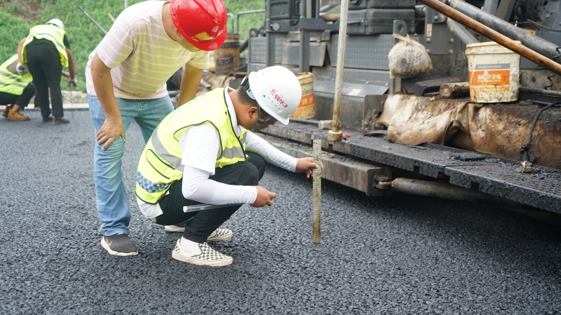 “这几天都连着干,国庆肯定也回来不到……”已在该项目组工作1年的现场施工管理员张锐拿着手机对母亲说道。对于家住四川德阳的张锐来说,距离不是回家最大的阻碍,能否如期完成项目,早日让高县通上高速成为他此时最大的牵挂。看着正在施工的沥青摊铺车和埋头苦干的工友们,张锐放下手机,赶忙上前加入到施工队伍中。