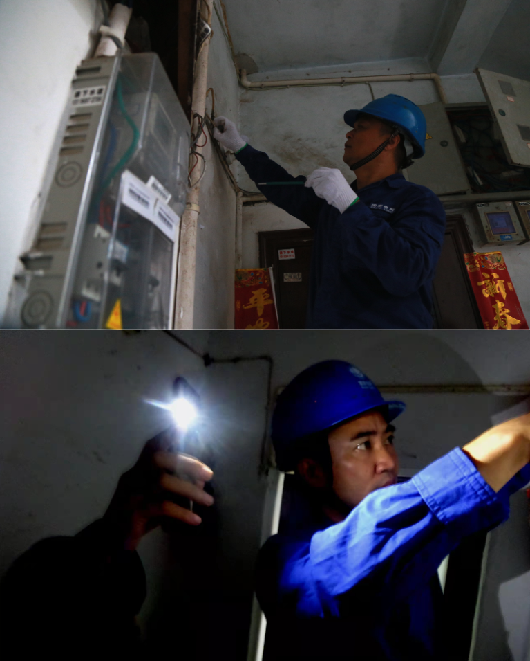 经过一番忙碌,两人终于在单元楼道花窗上方一大缕散乱的电线中,找到了仍被绝缘胶带包裹好的断线接头,他们这才如释重负地舒了口气。待重新处理好接线头,通上电,程培基家中灯光又亮了起来,在家人们一片“有电了!”的欢呼声中,两名电力工人也终于露出了会心的微笑。拭去汗水,他们匆匆踏上归途,身后只留下程培基一家殷切的挽留声:“辛苦了这半天,喝口水再走吧!”