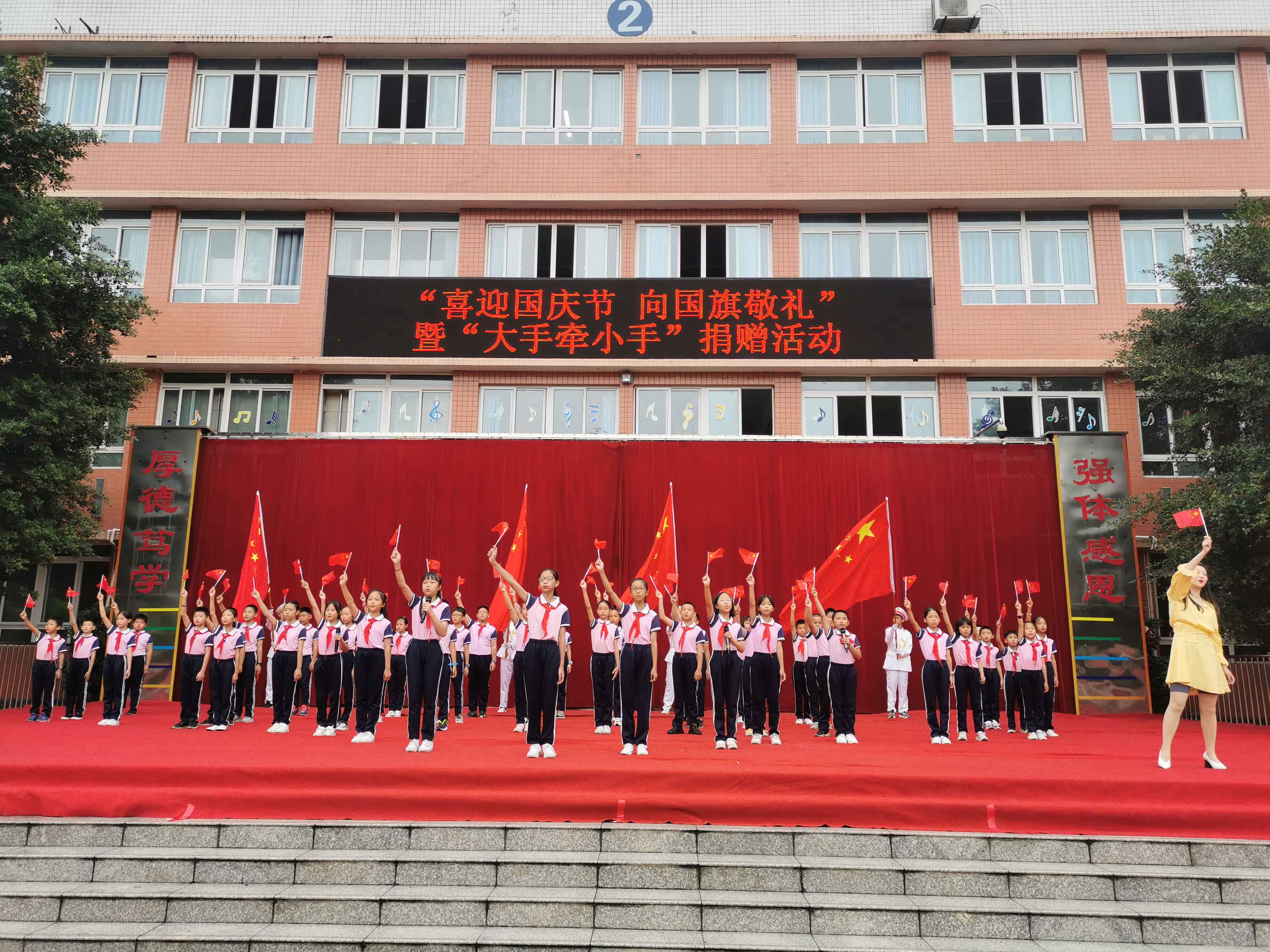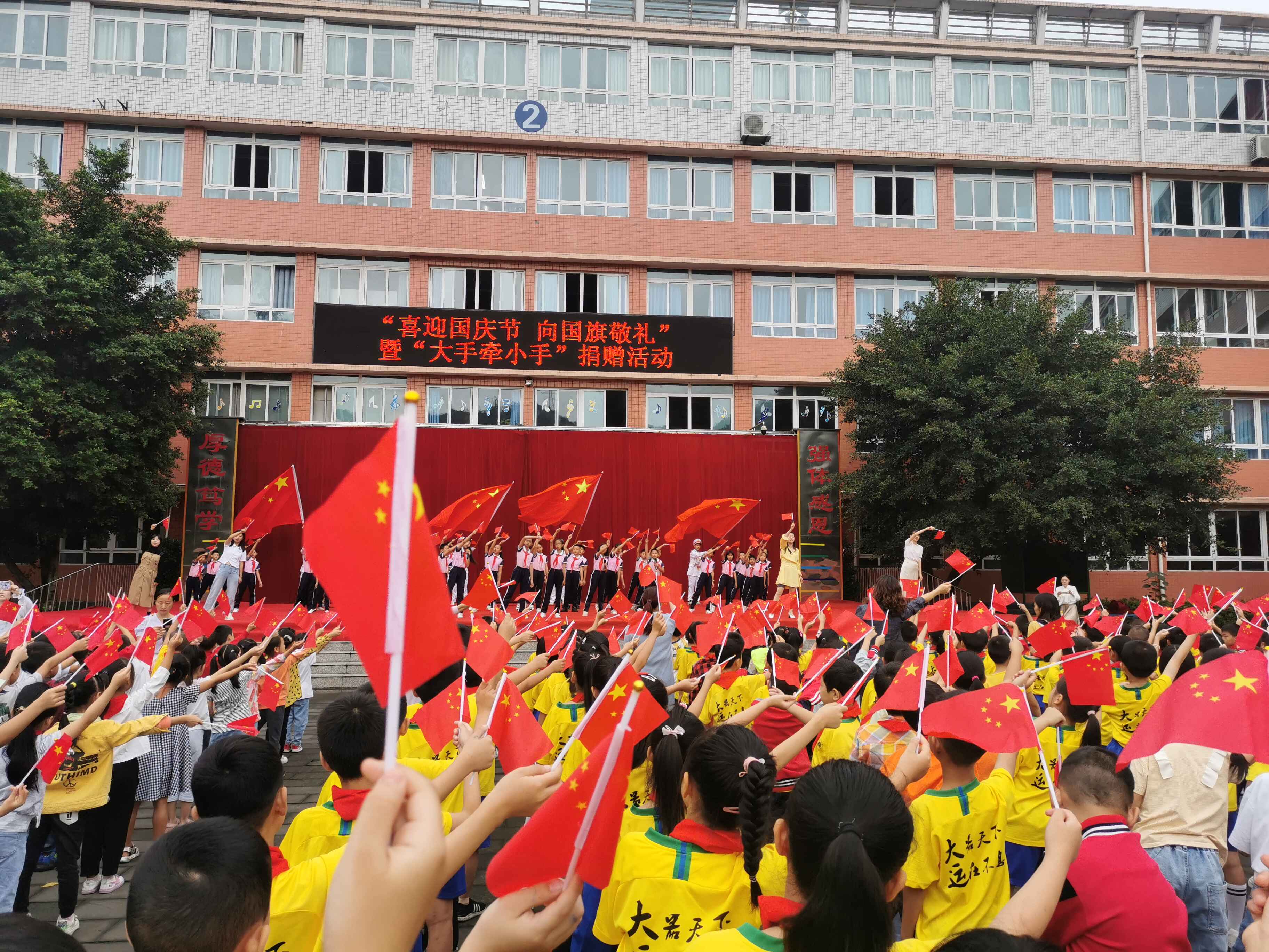 四川新闻网消息 9月27日上午,由西郊街道主办,大运实验学校承办的“喜迎国庆节 向国旗敬礼”升旗仪式暨“大手牵小手”捐赠活动,在大运实验学校操场召开。西郊街道党工委委员、组宣委员赵若君,关工委执行主任罗顺林等街道领导以及大运实验学校全体师生参加了本次活动,活动由学校少大队辅导员刘煜主持。