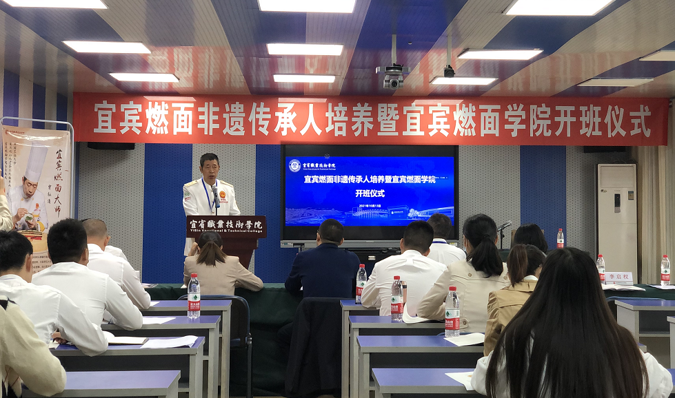 四川新闻网消息(赵富容 记者 周瑜原 摄影报道)“大家要利用接下来8天时间,认真学习宜宾燃面、姜鸭面、辣鸡面、生椒牛肉面、口蘑面、红烧肥肠面等12种面食的制作理论和实操,跟着曹大师,要把知识学懂,把技艺学牢,把服务学好,争做非遗传承人,学成归来为宜宾燃面产业发展贡献力量。”宜宾职业技术学院宜宾燃面学院院长陈寰说。10月13日,宜宾燃面非遗传承人培养暨宜宾燃面学院开班仪式举行在宜宾职业技术学院举行。