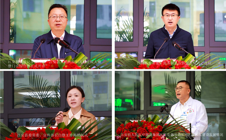 江安县委书记李强、县人大主任赵文年、常务副县长铁强、县人大副主任易奇志、宜宾市第二人民医院院长助理余得水博士、县级相关部门主要负责同志、县卫健系统部分干部职工、以及建设方、施工方代表和新闻媒体记者参加揭牌仪式。李强宣布“江安县人民医院妇儿科住院大楼暨门诊综合楼正式开诊”。江安县委常委、宣传部长白静主持此次揭牌仪式。
