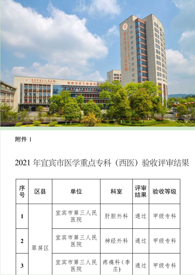 临床重点专科是一个学科实力的综合体现,代表该学科在医疗能力、技术水平、医疗质量、服务管理等方面居于全市医疗服务体系领先地位。近年来,宜宾市第三人民医院高度重视重点专科建设工作,加大对重点学科带头人和团队的引进和培养力度,重视医教研同步发展,鼓励各专科创建市级、省级临床重点专科。各专科在医院的引导扶持下,持续改进医疗质量,积极开展新技术新项目,提高临床专科服务能力,多个专科取得显著成效。