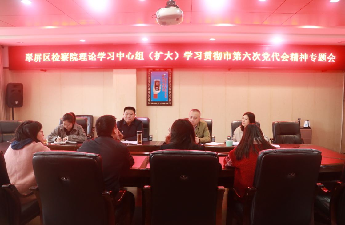 四川新闻网消息 近日,翠屏区检察院召开党组中心组(扩大)学习会,专题传达学习宜宾市第六次党代会精神,研究部署本院贯彻落实意见。会议由院党组书记付忠主持,全体班子成员、各部门负责人参加会议。