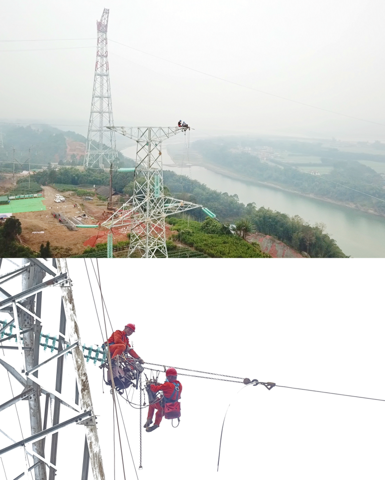 在岷江西岸特高压跨越塔附近,由国网宜宾供电公司承建,配合特高压工程施工的220千伏龚山线迁改工程现场一片热火朝天的景象,数名施工人员腾挪于银色高压塔线之上,挂线、收线、紧线……忙得不亦乐乎。几基铁塔从这边消失,很快又从别处拔地而起,重新矗立在绿水青山。12月16日,龚山线恢复送电,至此,220千伏龚山线迁改工程全部竣工投运,国网宜宾供电公司也圆满完成了助力特高压实现岷江大跨越的重要任务。