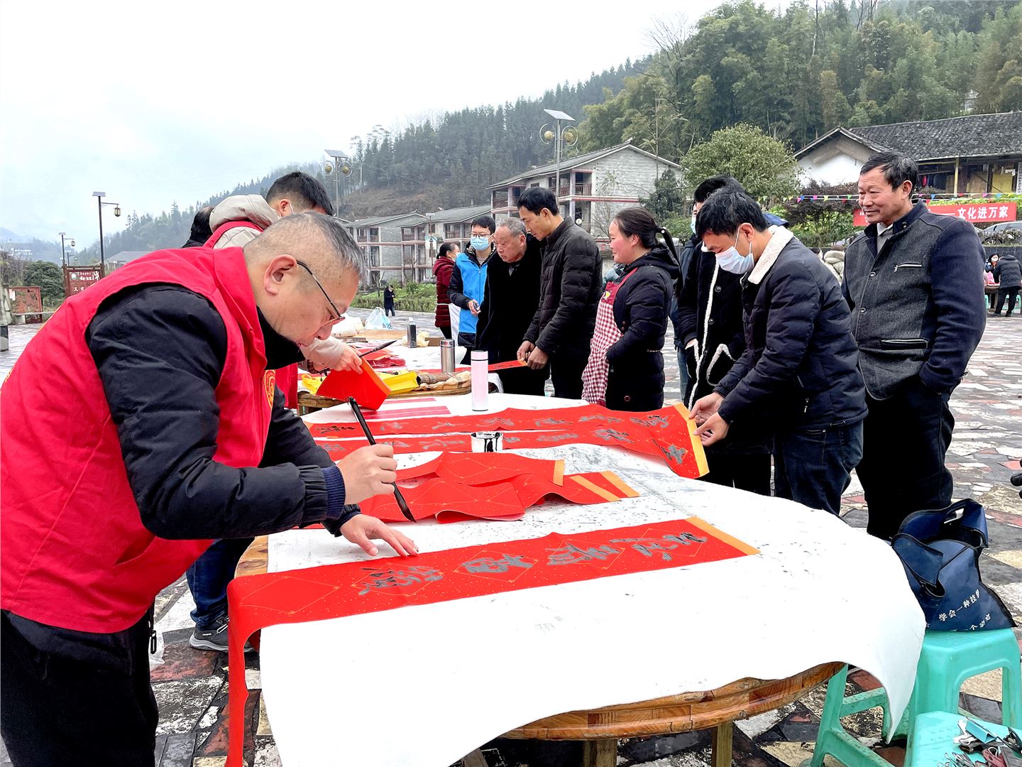 活动现场,筠连县科协、团县委、县卫生健康局、县农业农村局等部门的工作人员还向群众进行了科普宣传、农技宣传、艾滋病宣传、健康义诊活动,通过设立咨询台、发放宣传资料等形式,手把手向群众传授科技知识,实打实送文艺下基层,面对面开展医疗义诊咨询,让广大群众在家门口就能观演出、学政策、涨知识、看病就医。来自筠连县书法家协会的书法家们还在现场挥毫泼墨,为群众书写了近200余幅春联和“福”字,给苗乡老百姓送去了新春的美好祝福。