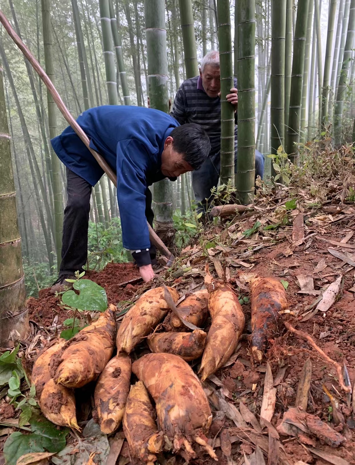 只见他麻利地抡起锄头,几下功夫,一个浅黄色的“小家伙”露出了尖尖的脑袋,笋农胡付从一边忙活,一边向笔者讲道,“根据竹叶的长势、竹梢的颜色,可判断出冬笋的位置,顺着竹根的方向便可将未破土的竹笋挖出来”。