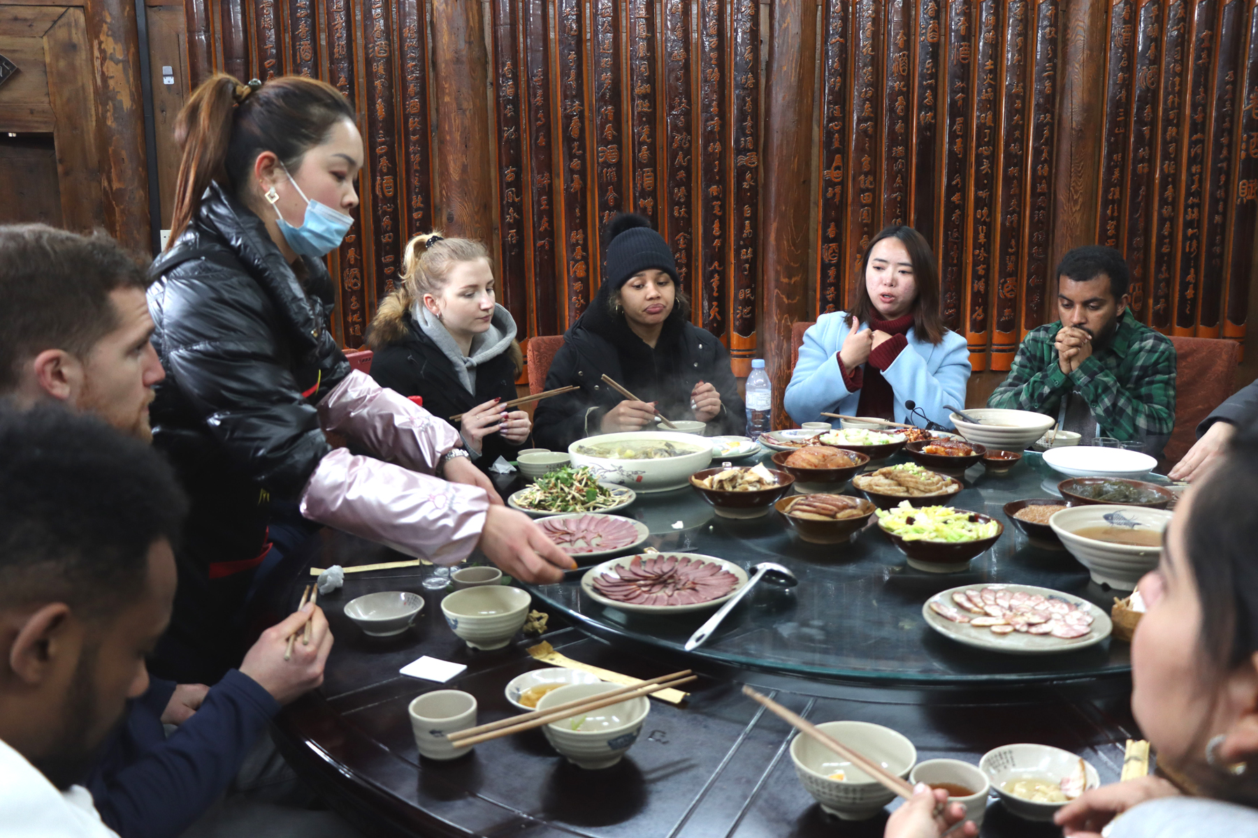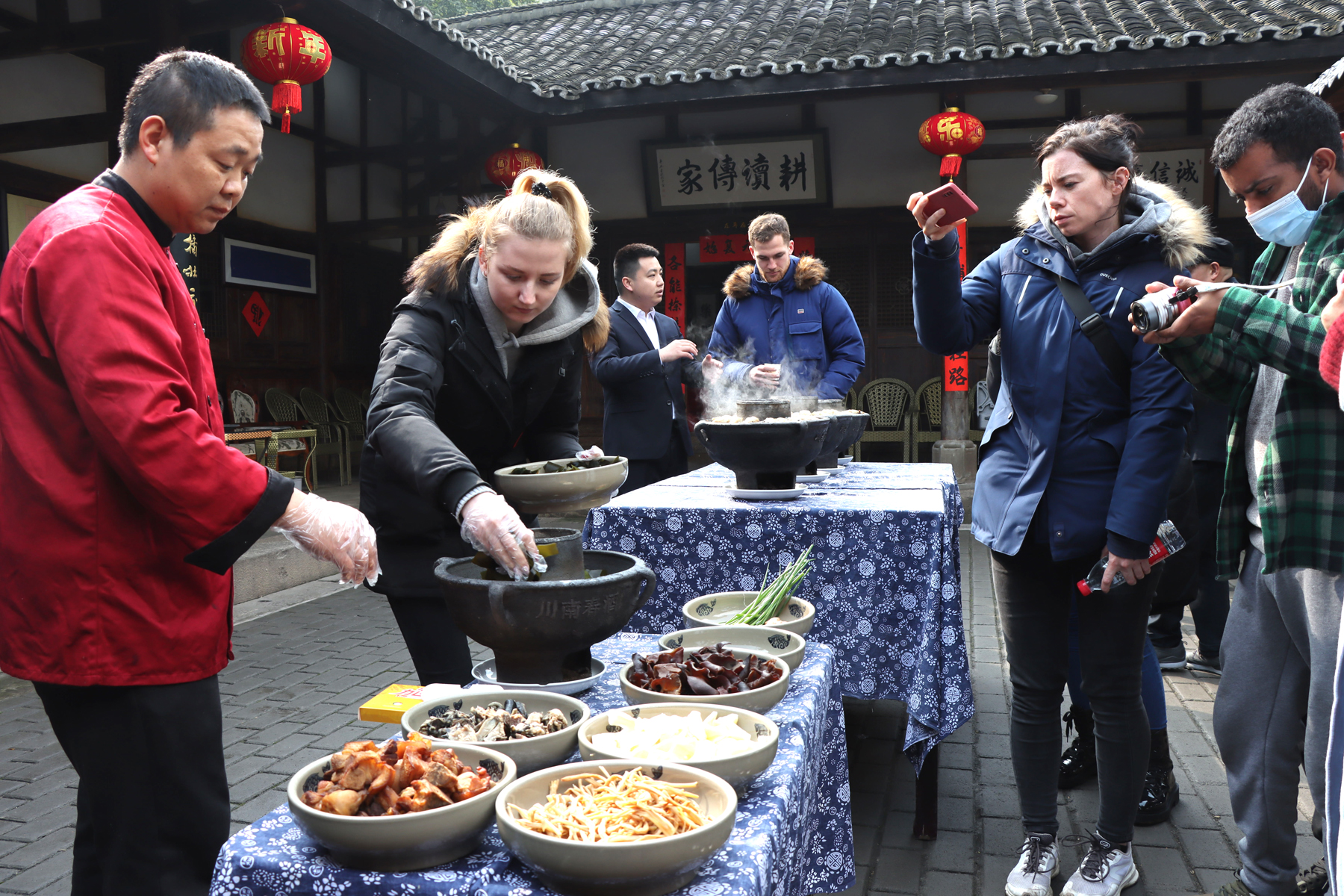 在该县庆岭镇刘家大院,外国客人体验了高县土火锅烹调制作,并体验四川省非物质文化遗产——“川南请春酒”。新鲜地道的本土食材、承载中国乡愁的“九大碗”、工序讲究地“高县土火锅”,无不展现出食材与味蕾的完美结合,外国客人对中国丰富多彩的饮食文化赞不绝口。