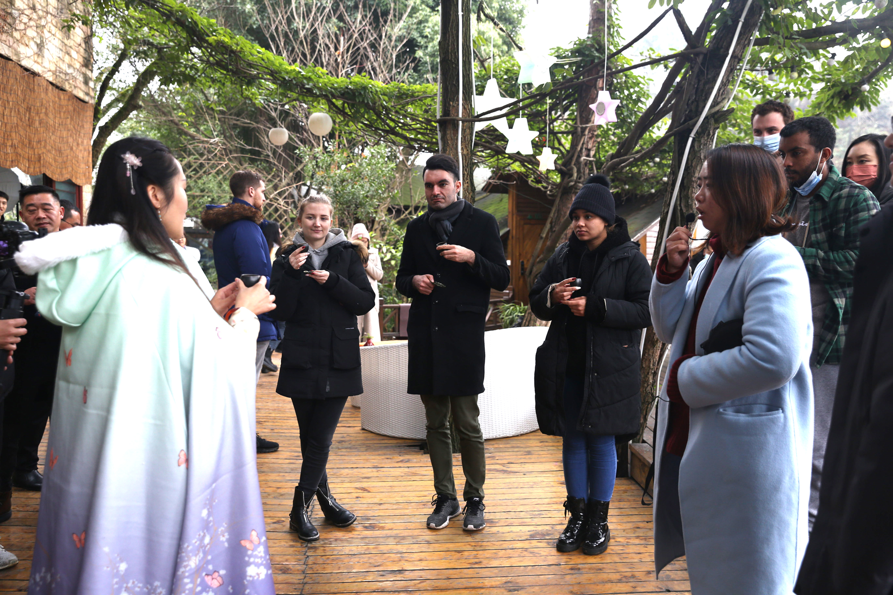 回味着饮食文化和中华优秀传统文化,外国客人来到高县来复镇大屋村林峰湖山庄品高县好茶。庄园内“雪花”飘洒,古筝欢快,茶香四溢,精彩的茶艺表演吸引外国友人驻足观看。“茶水七分满表示尊敬。端茶时,女士用兰花指表示优雅,男士要托底表示稳重……”外国客人在中国博大精深地茶文化里畅游。