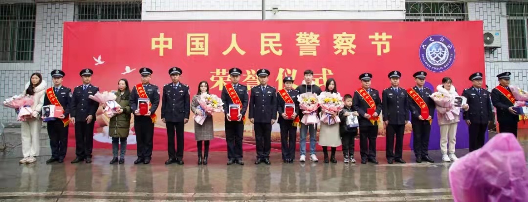 仪式在《中国人民警察警歌》中落下帷幕。仪式结束后,县局党委班子成员与获奖民辅警及家属代表合影留念。(供图稿:兴文县公安局刘友婧)
