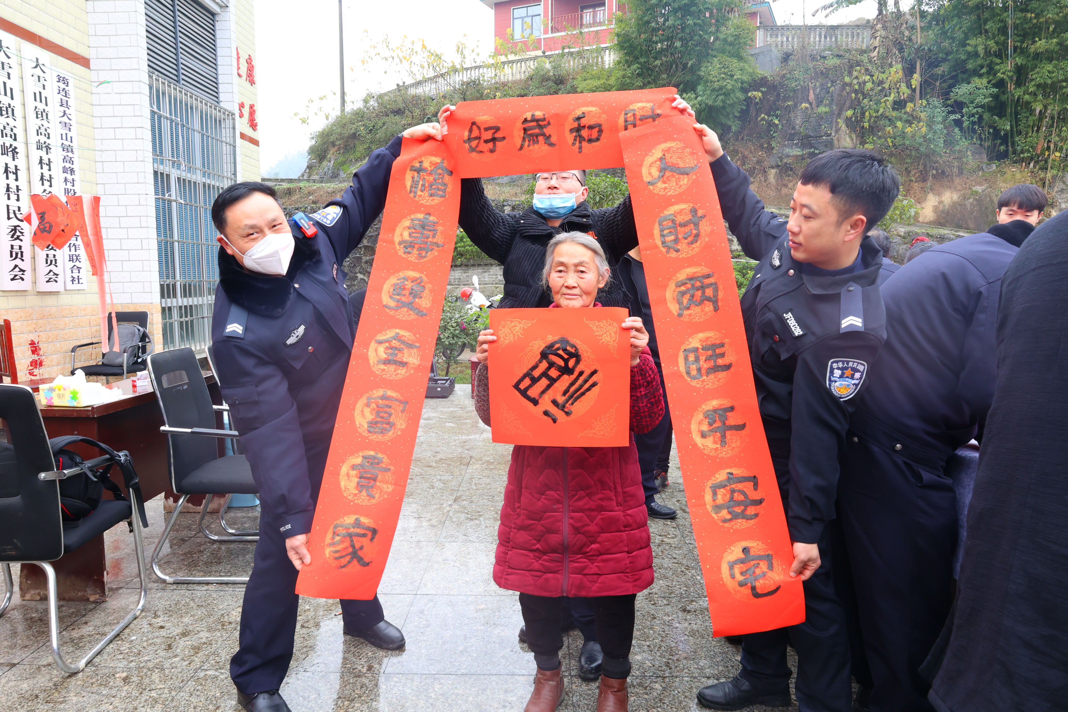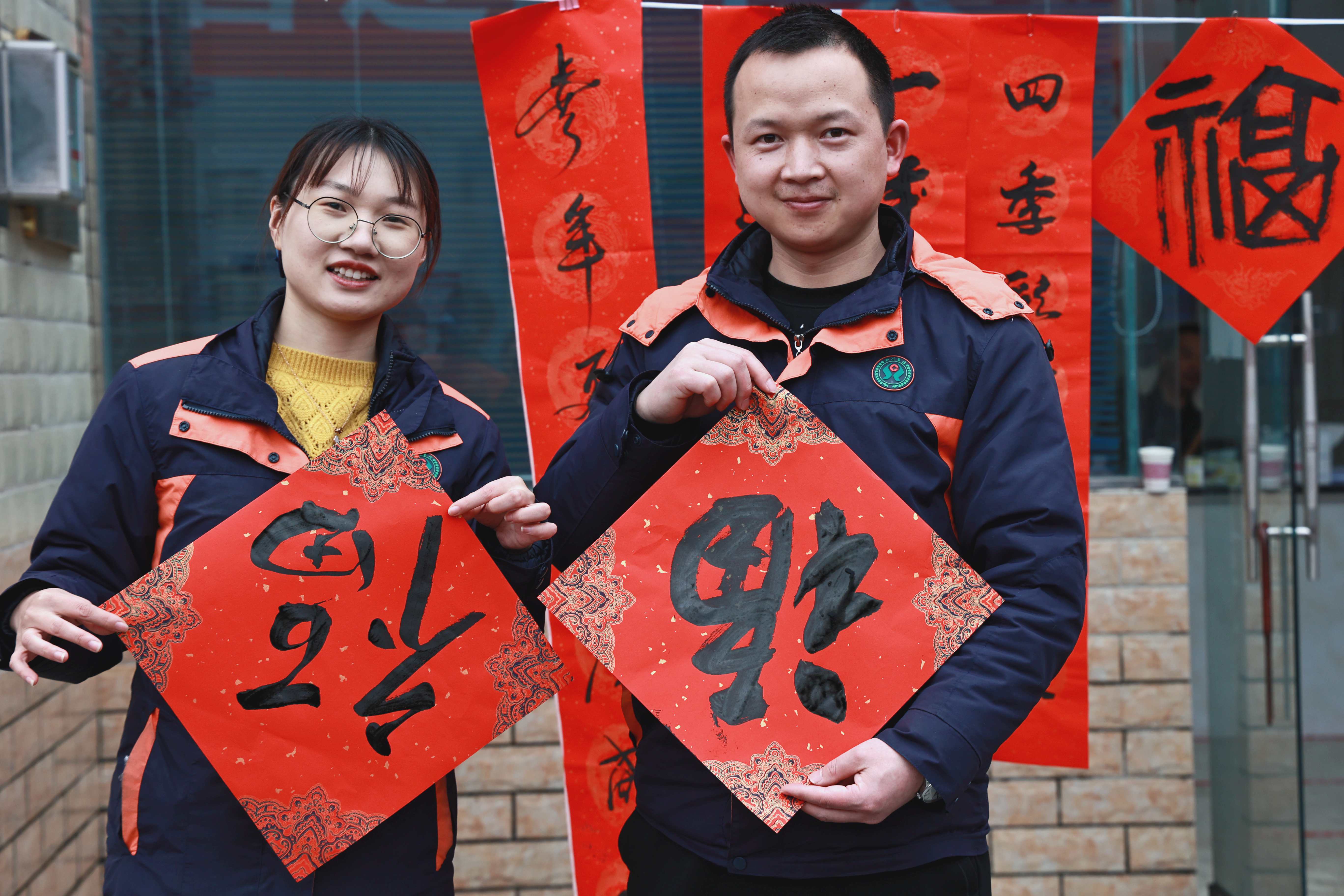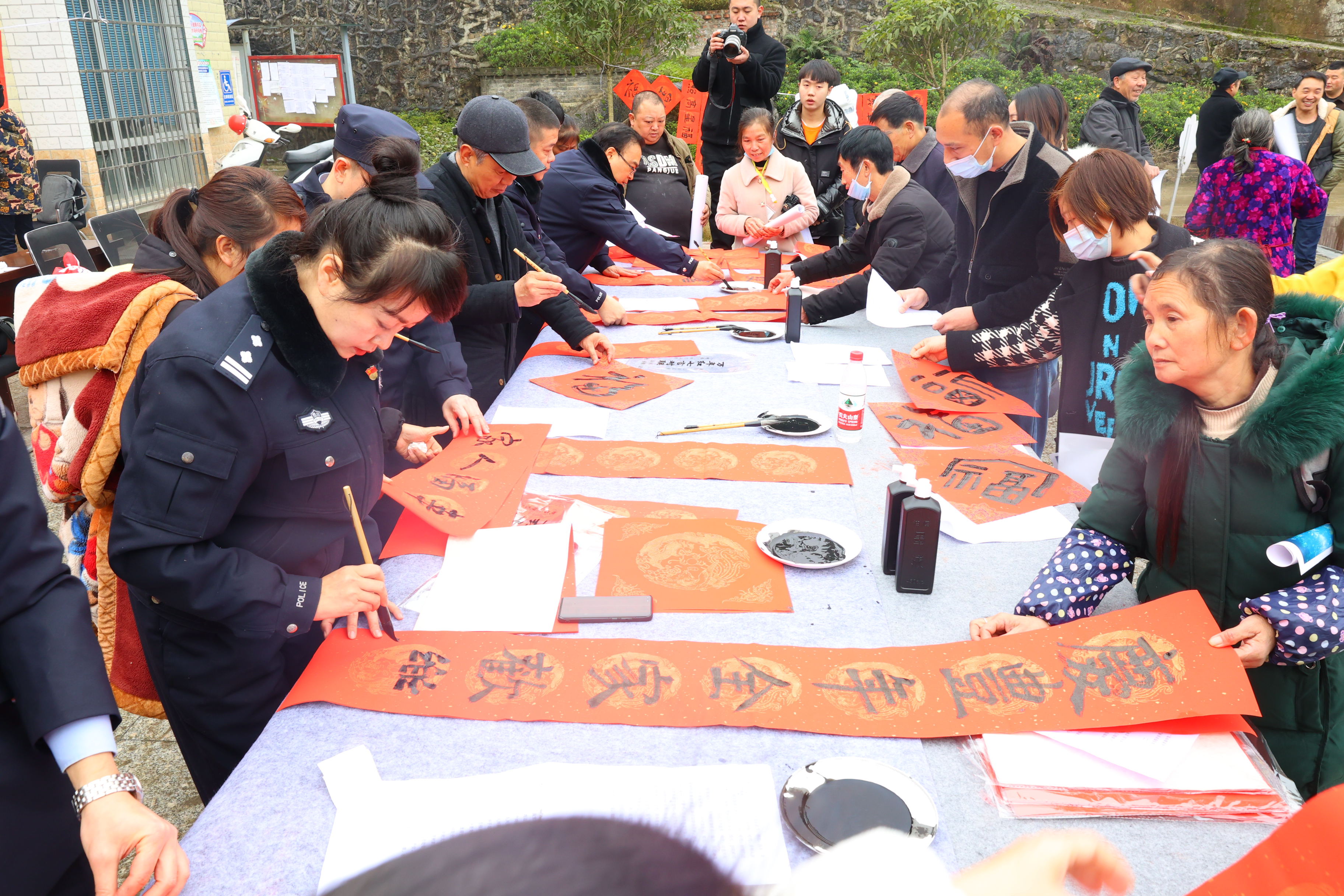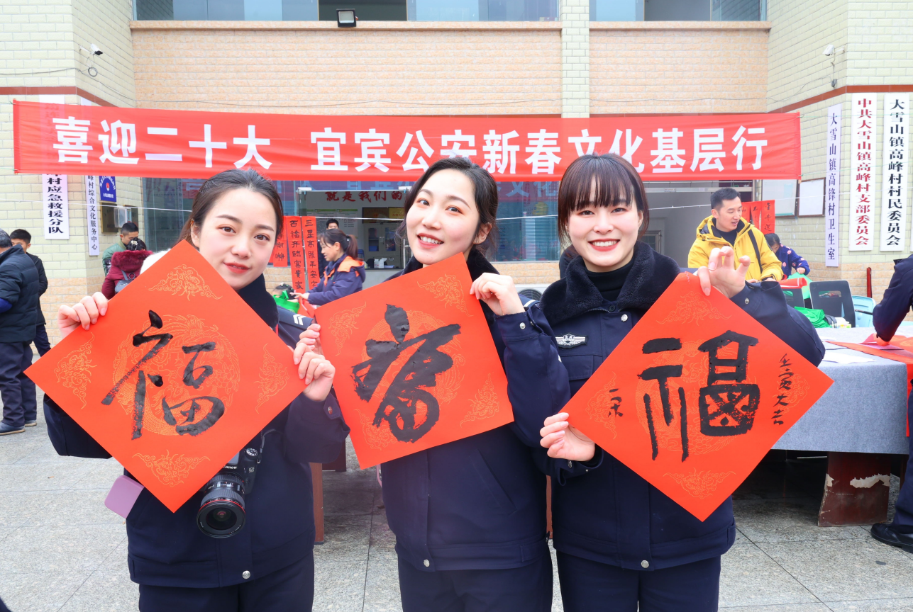 人财两旺平安宅,富贵双全幸福家,横批:时和岁好;吉星照地全家福,鸿运当头万事兴,横批:百花献瑞……宜宾公安文联的书法老师们挥毫泼墨,书写春联和福字送给现场的群众。一幅幅遒劲有力的福字和美好祝愿的春联,融入了他们对公安事业的热爱,表达了宜宾公安对广大人民群众新年美好的祝福。