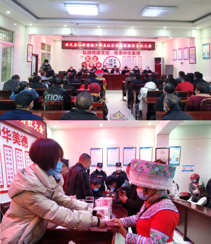 在严格做好疫情防控措施的前提下,该村集体经济分红大会在村党群服务中心大会议室召开,全村苗汉同胞欢聚一堂,共享村集体经济发展成果,在口罩遮挡下也掩盖不了大家充满幸福的脸庞,他们之中,有不少是刚刚返乡的农民工兄弟姐妹,看到近年来家乡发生了翻天覆地的变化,今天又领到一张张红色的百元大炒时,大家脸上都洋溢着身为群鱼人的自豪感和幸福感,在冰天雪地的仙峰山,大家也感受到这个大家庭的温暖!