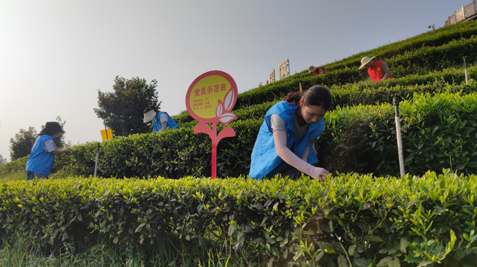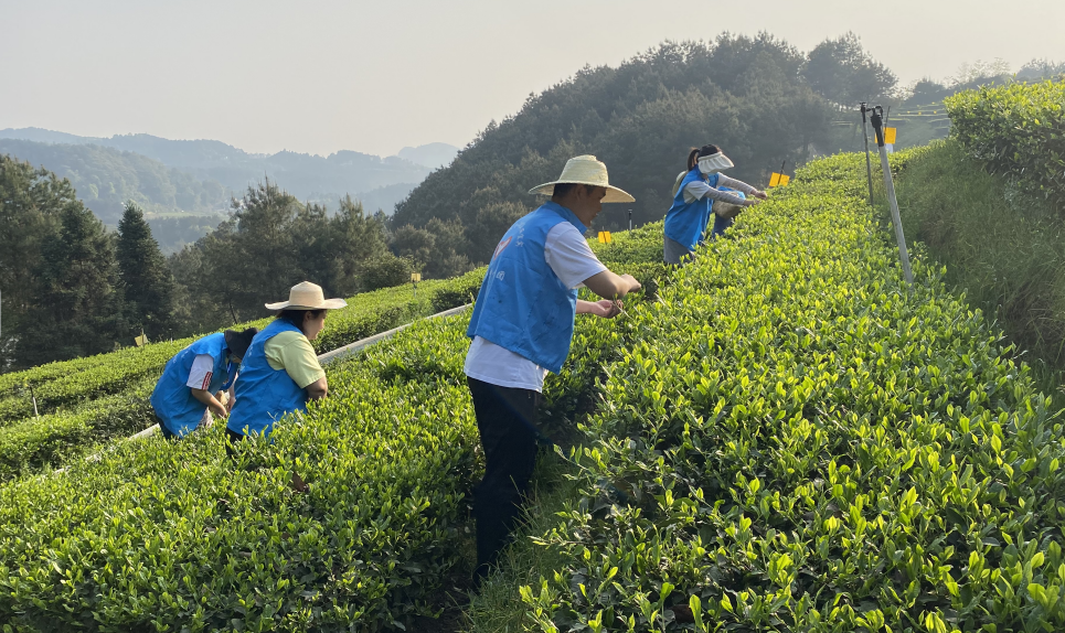 了解到村民在摘茶叶方面存在困难,来复镇积极发动全镇党员干部,组建青年突击队和便民服务小骑手一同走进茶园,帮助劳动力缺乏的茶农采茶,缓解近期采茶工短缺的问题。山坡上,一群身着红色和蓝色马甲的志愿者在一片翠绿中显得格外亮眼。