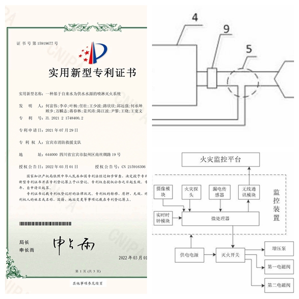 四川新闻网消息 近日,从国家知识产权局传来喜讯,由宜宾市消防救援支队自主研发的“一种基于自来水为供水水源的喷淋灭火系统”,获批国家实用新型专利。