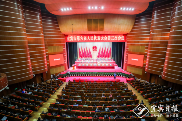 4月7日下午,宜宾市第六届人民代表大会第二次会议第一次全体会议在酒都剧场召开。