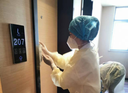 感染风险不仅仅来自我们的工作区域,交通、生活区域也存在潜在的院感风险,所以我们每天会对交通车、酒店过道、楼梯、电梯、门把手等地方进行统一消杀,且对高频接触物表核酸检测;工作后返回酒店须对外部衣物消毒处理,并且对居住房间物表每日至少消毒一次;出房间门必须戴好口罩,做好手卫生。