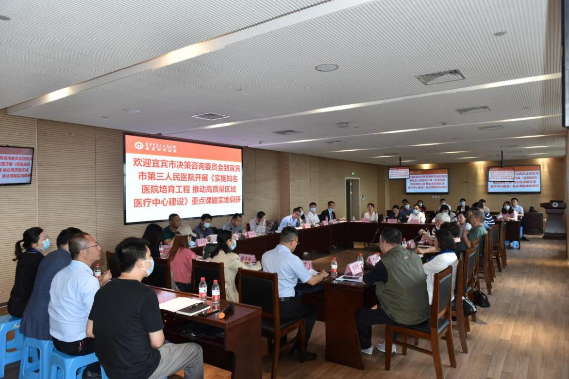 四川新闻网消息(周瑜原 伍小倩 郭文强)4月24日下午,宜宾市决策咨询委员会副主任、课题组组长李毅带领《实施知名医院培育工程 推动高质量区域医疗中心建设》重点课题组一行到宜宾市第三人民医院开展专题调研,并召开座谈会。翠屏区决咨委、区政府办公室、区委编办、区卫生健康局、区人力资源和社会保障局、区医保局,宜宾市第三人民医院、宜宾市第二中医医院、宜宾市翠屏区妇幼保健院相关负责人陪同调研并参与座谈会。