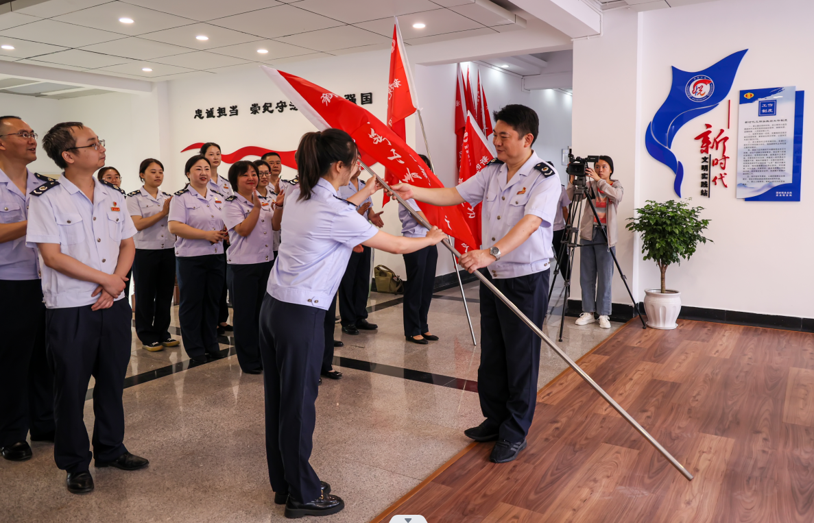 黄新有、张春元、康瑛、李恒同志为高县税务局新时代文明实践站揭牌;张春元同志为高县税务局新时代文明实践分队授旗;李恒同志为6支新时代实践小分队授旗。