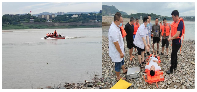 随后,组织参训人员到达预期勘察好的水域,针对突发汛情开展水上应急救援及溺水人员紧急施救演练。在防汛指挥部统一指挥调度下,应急救援组驾驶冲锋舟迅速开展水上救援行动,医疗保障组对救援上岸的溺水人员进行紧急救治,同时对参演者现场讲解急救互救知识。