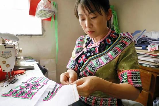 以创新助推乡村振兴。作为苗族服饰非遗传承人,罗文芬深知只有发挥自身非遗传承人的领头作用,当好美丽乡村人,传承民族文化魂,才能把以民族特色文化建设美丽乡村的这个“梦”做得更大更圆,为乡村振兴事业贡献力量。随着时间的积累,罗文芬的苗绣技法越来越熟练,绣出的图案越来越精美,她的作品里出现较多的有江河、火莲花、蝴蝶等,现今又加入了新元素、新花纹,苗族服饰也创新了短款、短裙。当传统与时尚碰撞,当苗绣与产业融合,苗绣已不仅仅是苗族人世代延续的传统手工,更是带动苗乡增收致富的时尚产业。