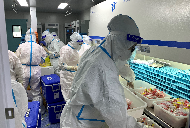 舱外的实验室里,标本收集、试管编码、信息录入、整合收纳……协助完成核酸检测的辅助人员每天三班倒作业,抢抓时间、一刻不停地做着准备工作,为尽快尽好开展核酸检测做好前端保障。由于样本量大、手部操作多,换班时大家的手都会止不住地颤抖。