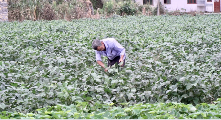 村民梅云康翻开豆叶查找病虫害