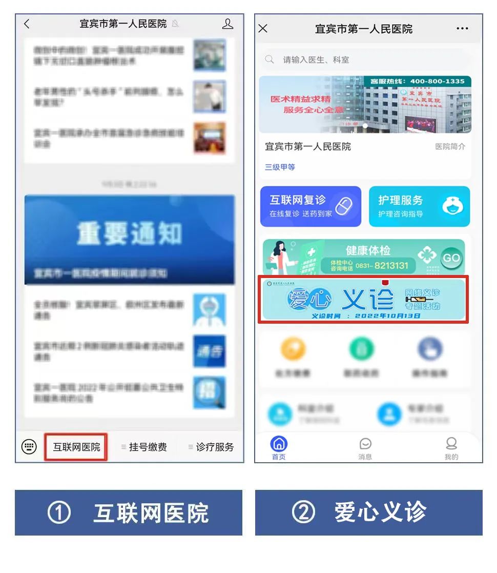 1.宜宾市第一人民医院微信公众号——互联网医院,选择“爱心义诊”活动专区(10月13日显示相关信息)。