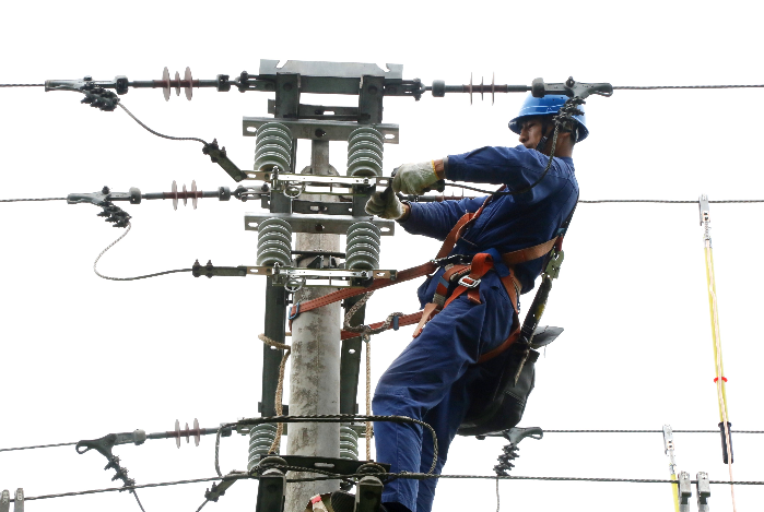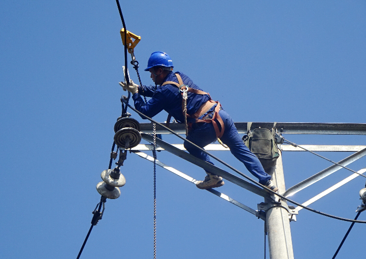| 国网江安县供电公司员工张淼正在开展秋季检修工作,更换耐张线夹 |