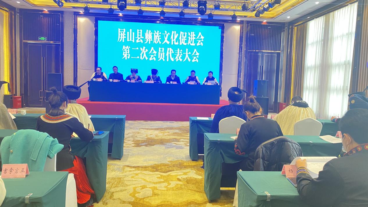 会议总结了五年来的工作。屏山县彝促会自2016年成立以来,坚持围绕屏山县委、县政府中心工作,服务统一战线大局工作,以铸牢中华民族共同体意识为主线,在传承、弘扬和发展彝族优秀文化方面取得了一系列的成绩。一是打造了彝族文化品牌。申报“屏山彝族新年”市级非物质文化遗产成功。二是创作了优秀艺术作品。编撰了《屏山彝族由来与现状》文史专辑,创作歌曲《世界夷都》、《第一书记》、《无名英雄》,舞蹈《抢亲》等艺术作品。三是展现彝族风采。参加了第三届屏山县油菜花节暨川滇少数民族艺术大赛、宜宾市少数民族文艺大赛、受邀到浙江海盐县演出等。