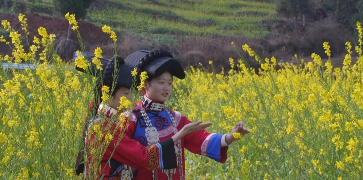 游客曹女士介绍:“种油菜花的地方有很多,不过油菜花开的最早还是要看中都镇。我们最近趁着晴好天气,和朋友一起过来拍照游玩,还体验了民族风情,感觉特别好。”