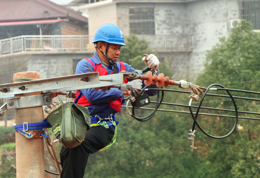 施工现场,队员分成两组一组安装台架变压器,另一组架设10千伏连接线路。停电、验电、装设接地线,在做好一切可靠安全措施后队员们纷纷进入自己预定的作业位置开始自己的作业,在现场有的安装金具、横担;有的立杆、展放导线;有的做好材料转移辅助工作。在安装完成台架横担后,施工作业进入最繁忙的变压器、配电柜吊装程序。“往左边一点点、再来一点点,慢慢地放……”专职监护人蒋运春不时地提醒吊装人员。