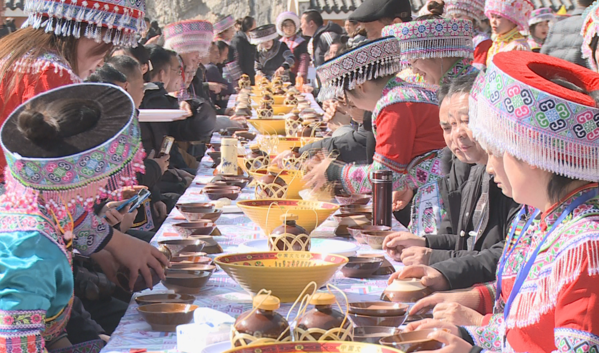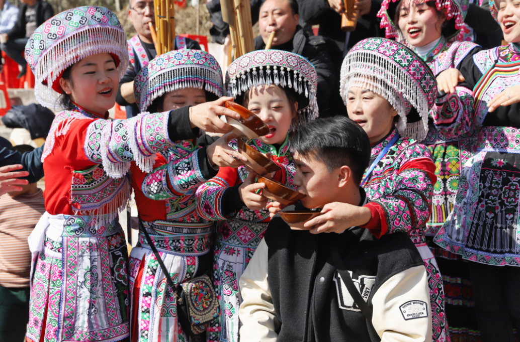 四川新闻网消息 1月29日(正月初八),兴文县迎春村的文化广场一派热闹喜庆,苗族同胞们身着精美的民族服饰,以悠扬芦笙迎宾、醇香米酒待客,热情接待前来参加踩花山的客人。