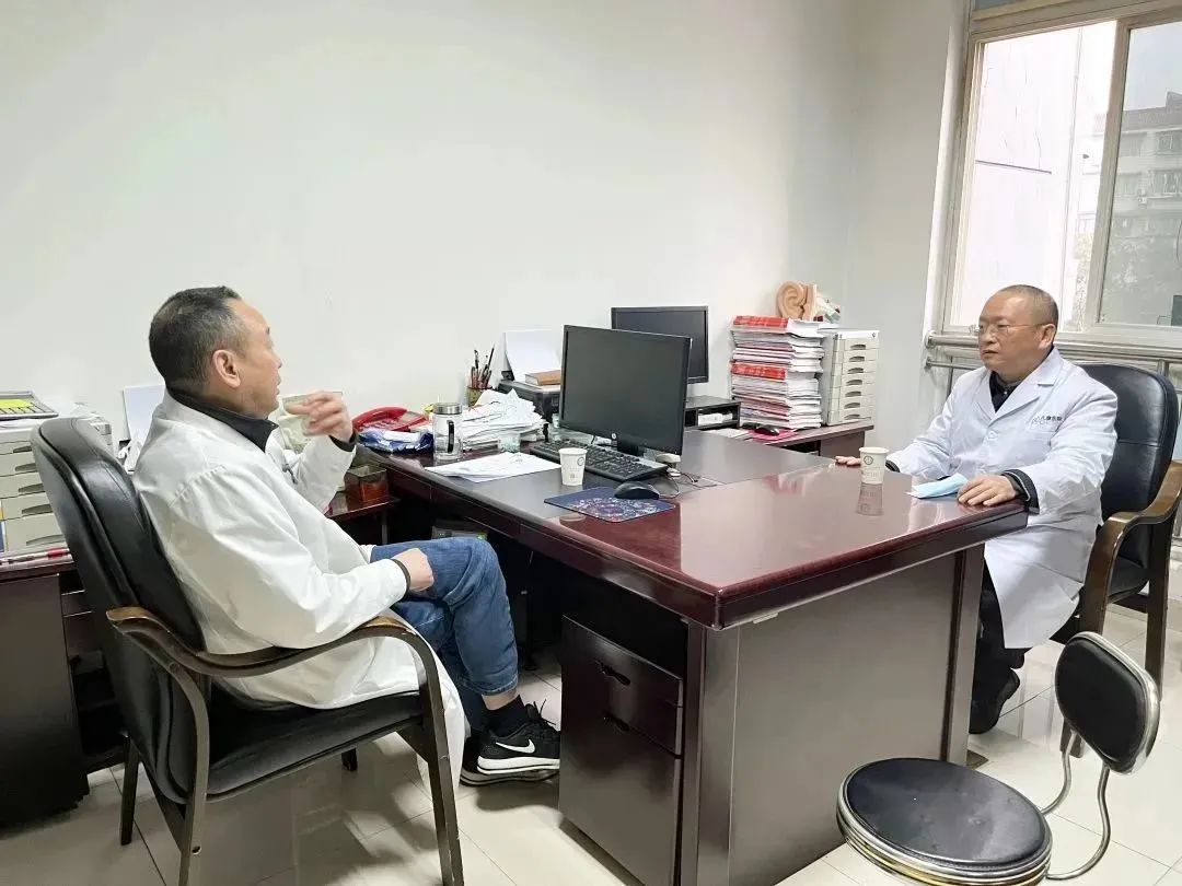重医儿院耳鼻咽喉科主任、主任医师姚红兵(右)在一医院耳鼻咽喉科了解科室发展情况
