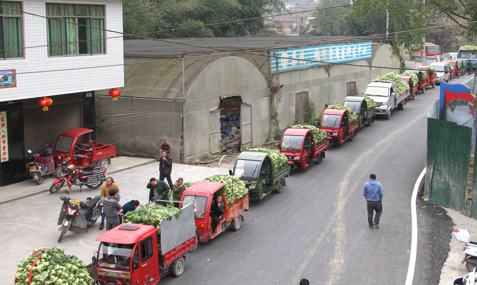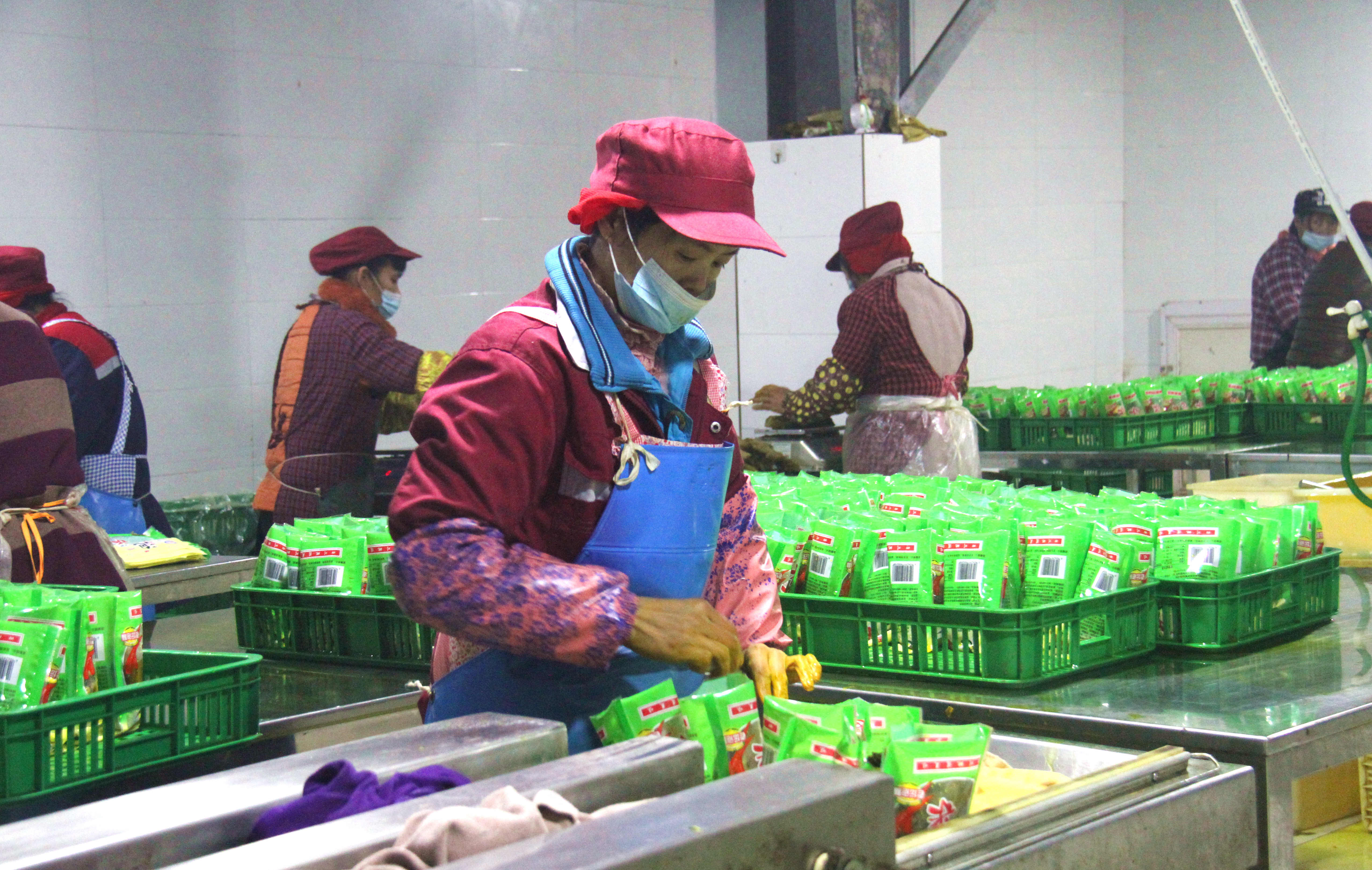 饱满的订单为企业带来了十足的生产动力。在位于高县庆符镇的四川腾耀农业科技开发有限责任公司,同样上演着热火朝天的生产景象。该企业是一家以生产泡菜和调味料为主的蔬菜加工企业,眼下正值青菜采收季节,满载青菜的货车排着长龙开进厂区,流水线上蔬菜制品正源源不断下线,工人们忙碌着对各类产品进行塑封装箱,通过电商物流送往全国各地。