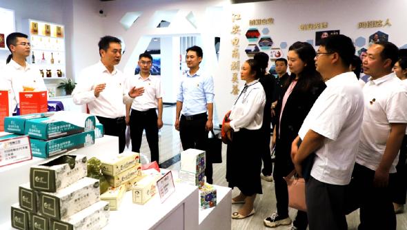 | 江安县委常委组织部部长樊尚君(左二)引领参会人员参观江安县电子商务产业园,不时向大家推介当地特色商(产)品和园区建设情况等 石兴旺 摄 |
