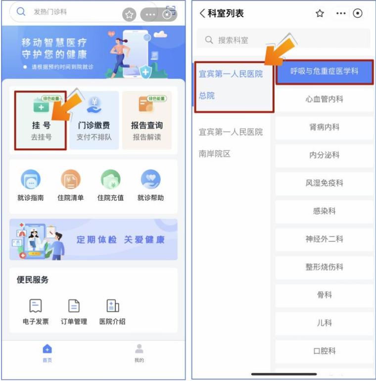 1.点击“挂号”,选择“就诊科室”--“就诊医生”。