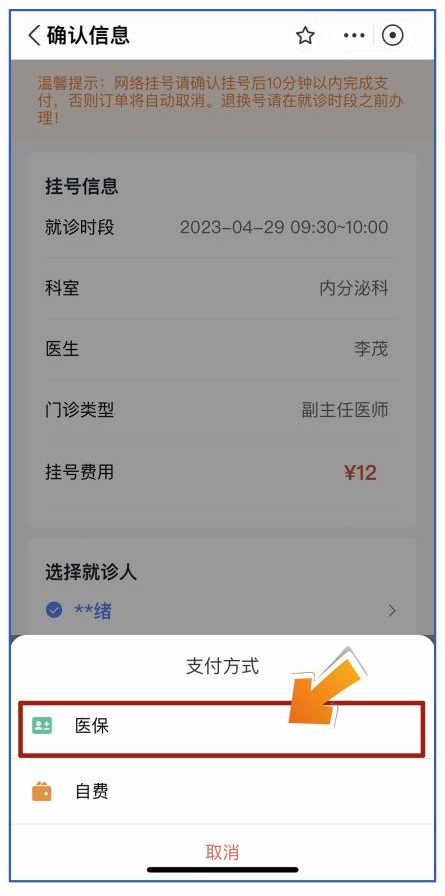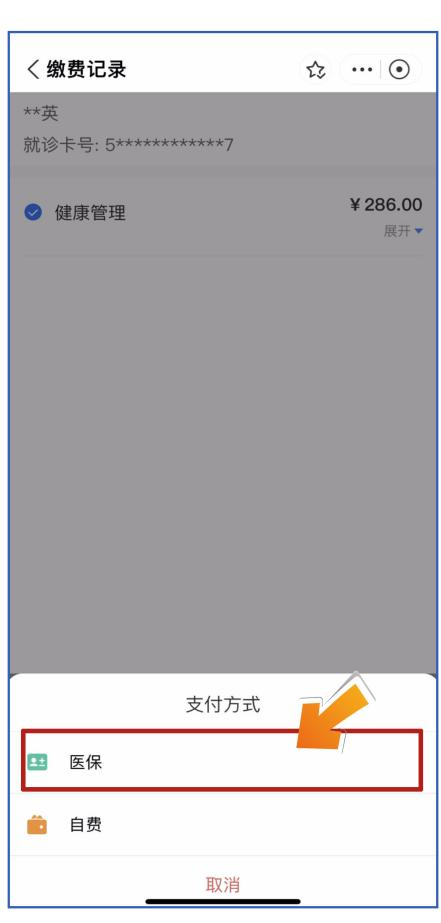 2.支付方式选择“医保”支付,按页面提示进行缴费。